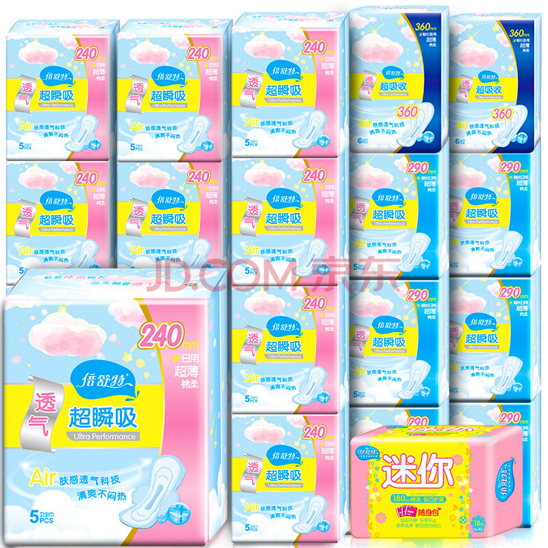 倍舒特透气棉柔超薄卫生巾日夜组合优惠套装120片 240mm60片 290mm30片 360mm12片 180mm18片 爱稳赢商城
