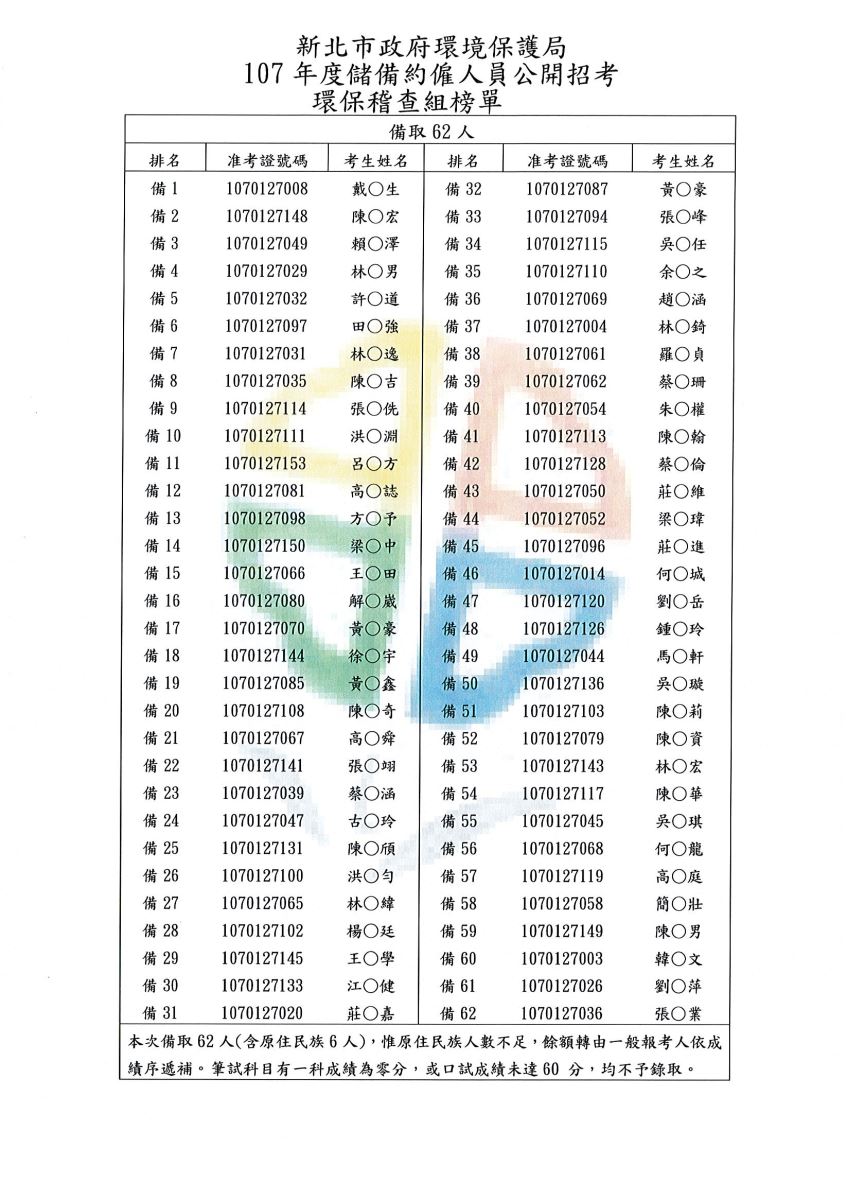 107年度儲備約僱人員公開招考稽查組榜單 新北市政府環境保護局